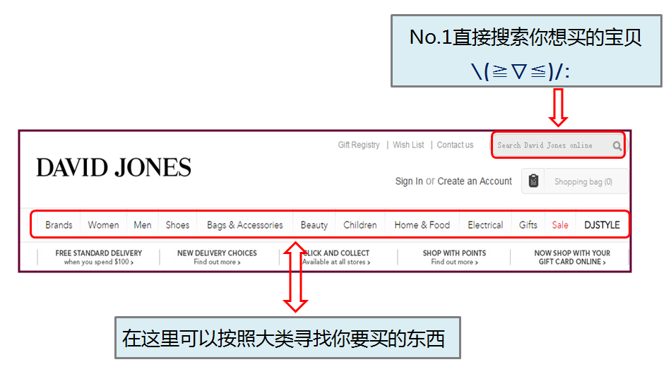 David Jones( http://shop.davidjones.com.au)是澳洲百货公司的两大巨头之一(另一家是MYER),同时也是澳大利亚最古老的百货商店,距今已有170多年的历史,相较之下David Jones的定位比MYER更高端,销售许多Myer没有的国际一线品牌如Valentino、Chloe、Armani、Alexander Wang等。